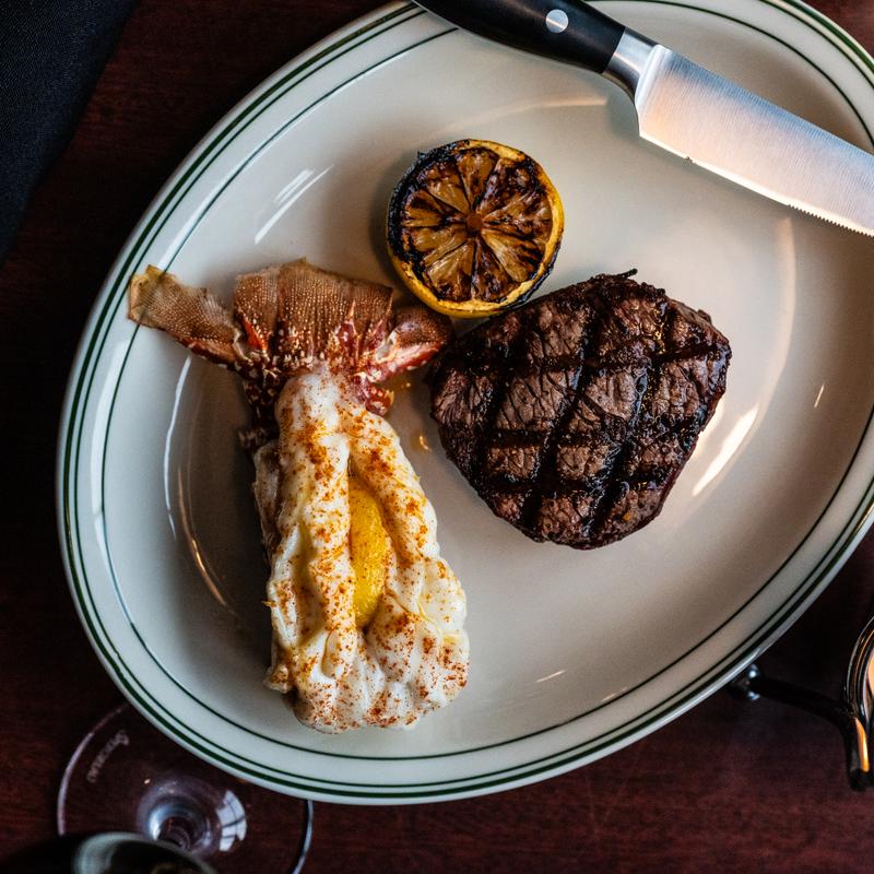 One cold water lobster tail paired with a 7oz Bacon Wrapped Fillet Mignon.