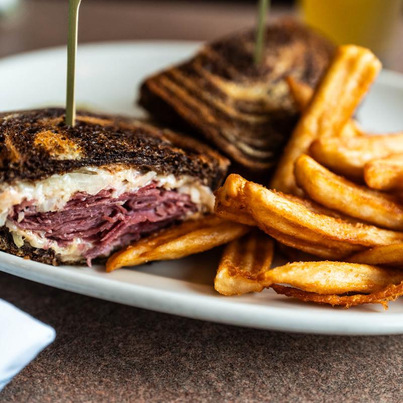 Corned beef, sauerkraut, swiss, and 1000 Island on marble rye.