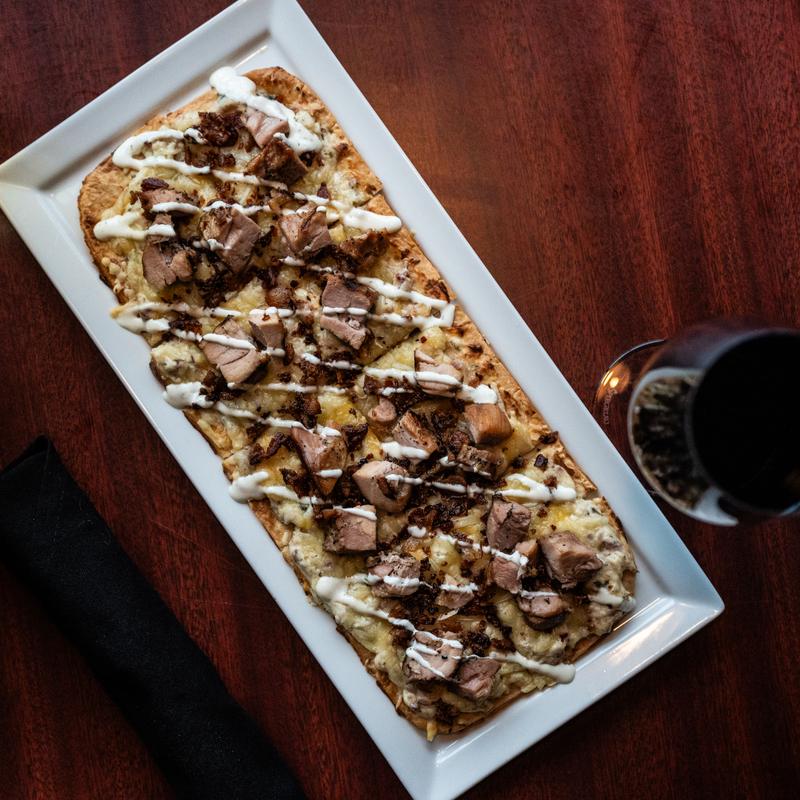1/2 of a Chicken Bacon Ranch Flatbread severed with your choice of salad.