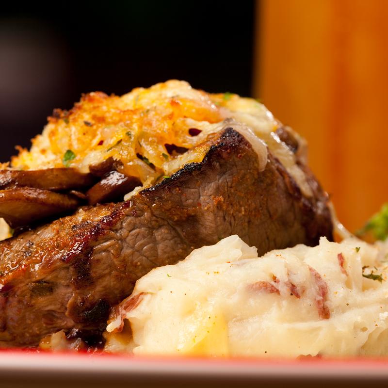 Sirloin seasoned with Cajun and topped with sautéed onions, mushrooms, peppers, and a blend of 3 cheeses on top of garlic mashed.