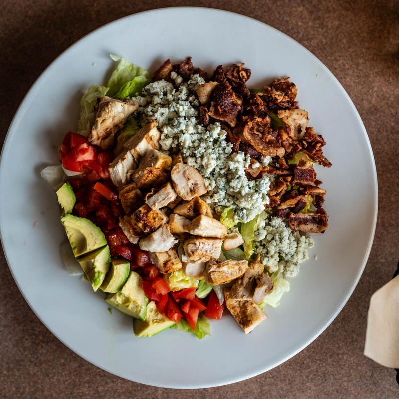 Diced grilled chicken, avocado, bacon, bleu cheese crumbles and tomatoes.