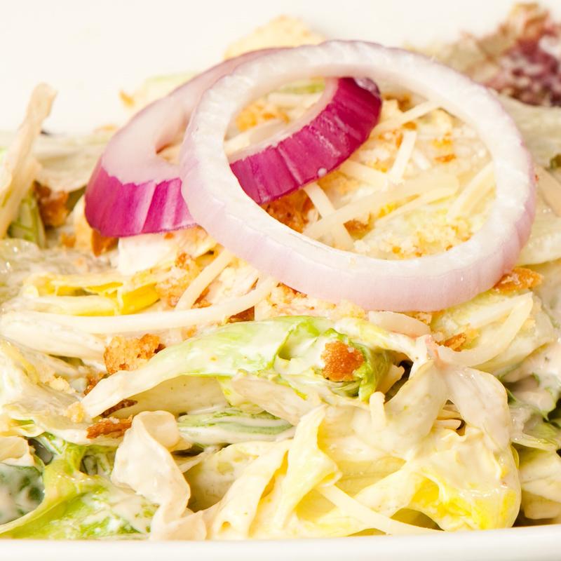 Romaine, crumbled bleu cheese, walnuts, onions, and Caesar dressing.